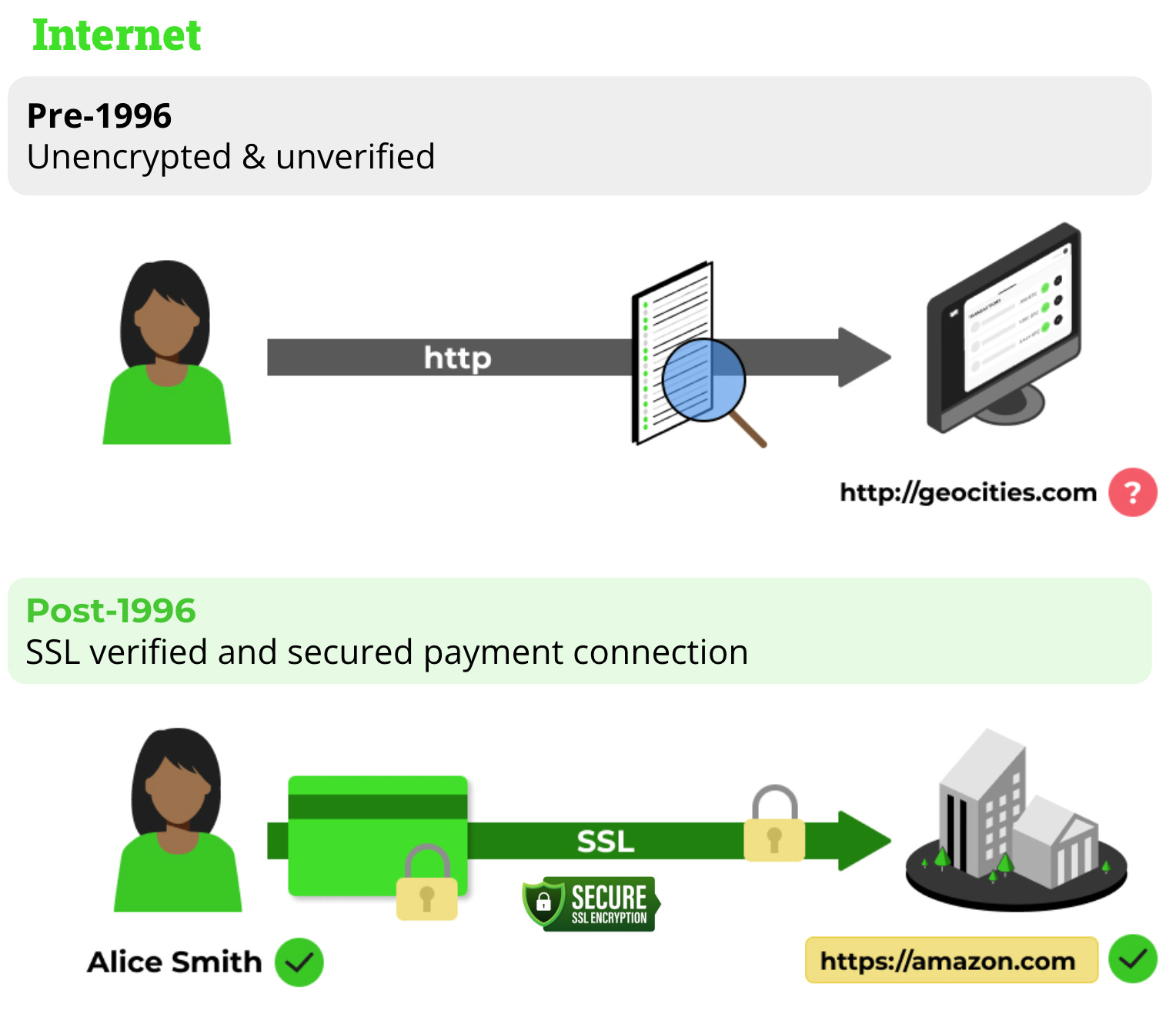 The internet's commerce problem was solved through the development of critical security protocols. In 1995, Netscape introduced the Secure Sockets Layer (SSL) protocol, which revolutionized how information was transmitted online.